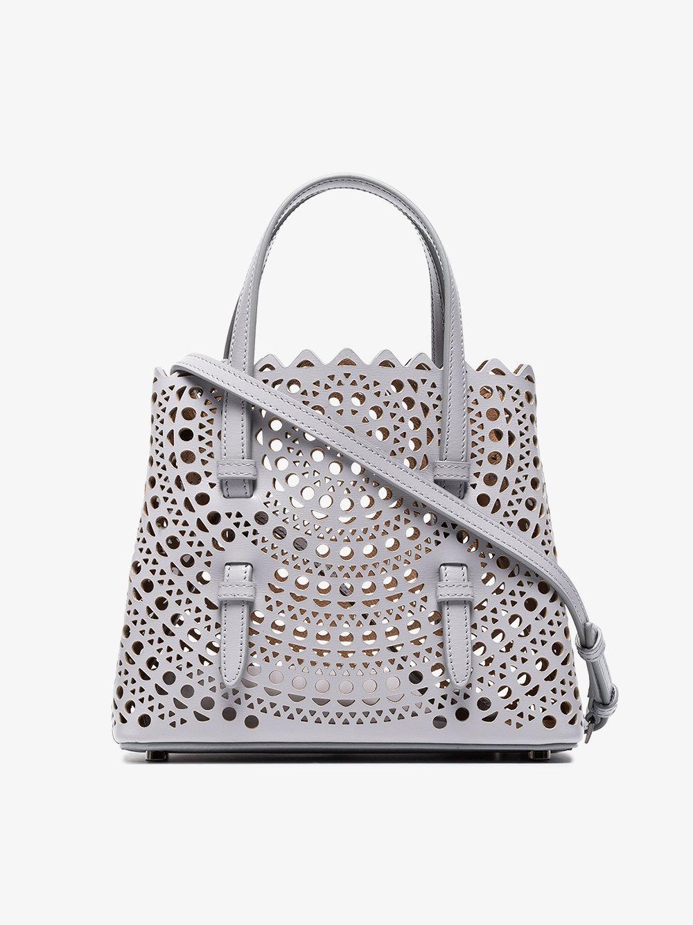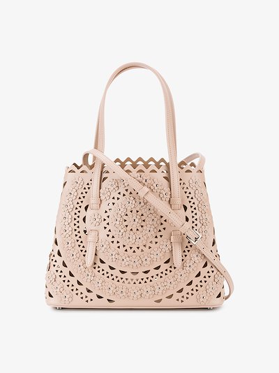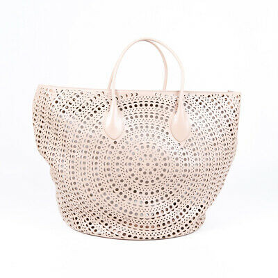 Alaia Laser Cut Tote : Patent leather clutch, signature laser cut with flower detail, adjustable/ removable mirror and envelope magnetic snap flap closure.